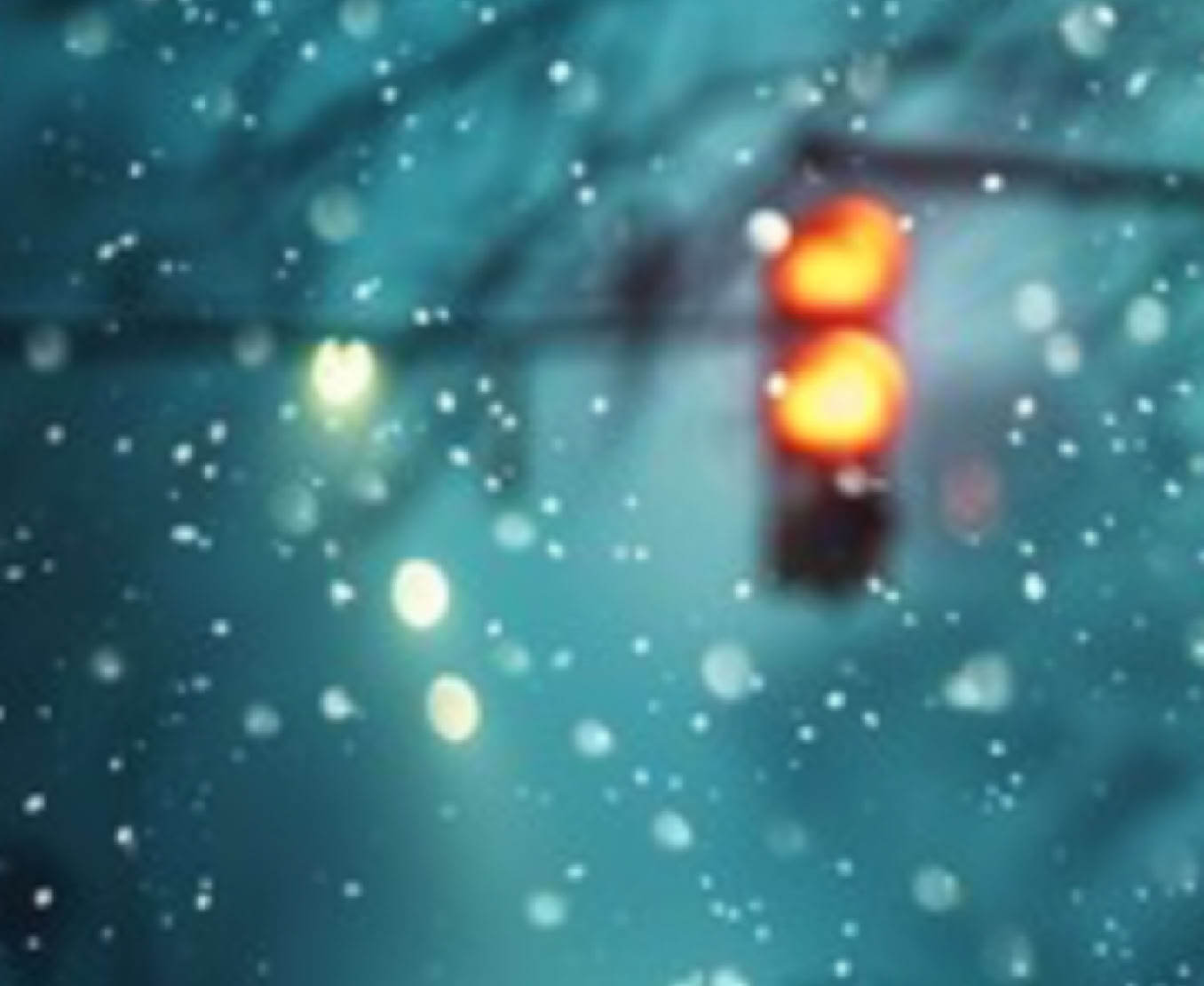 The flashing traffic light hanging over the asphalt intersection gently sways with the breeze and silently reflects its gleam in the winter snow.