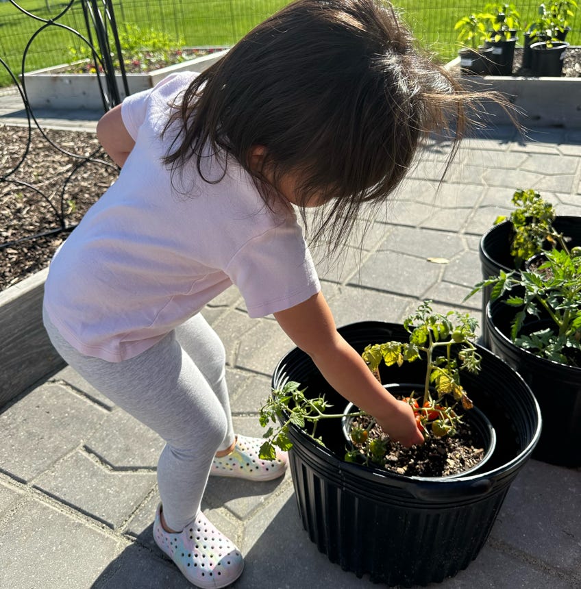May 14 Great Granddaughter picks the first garden ripe tomatoes.