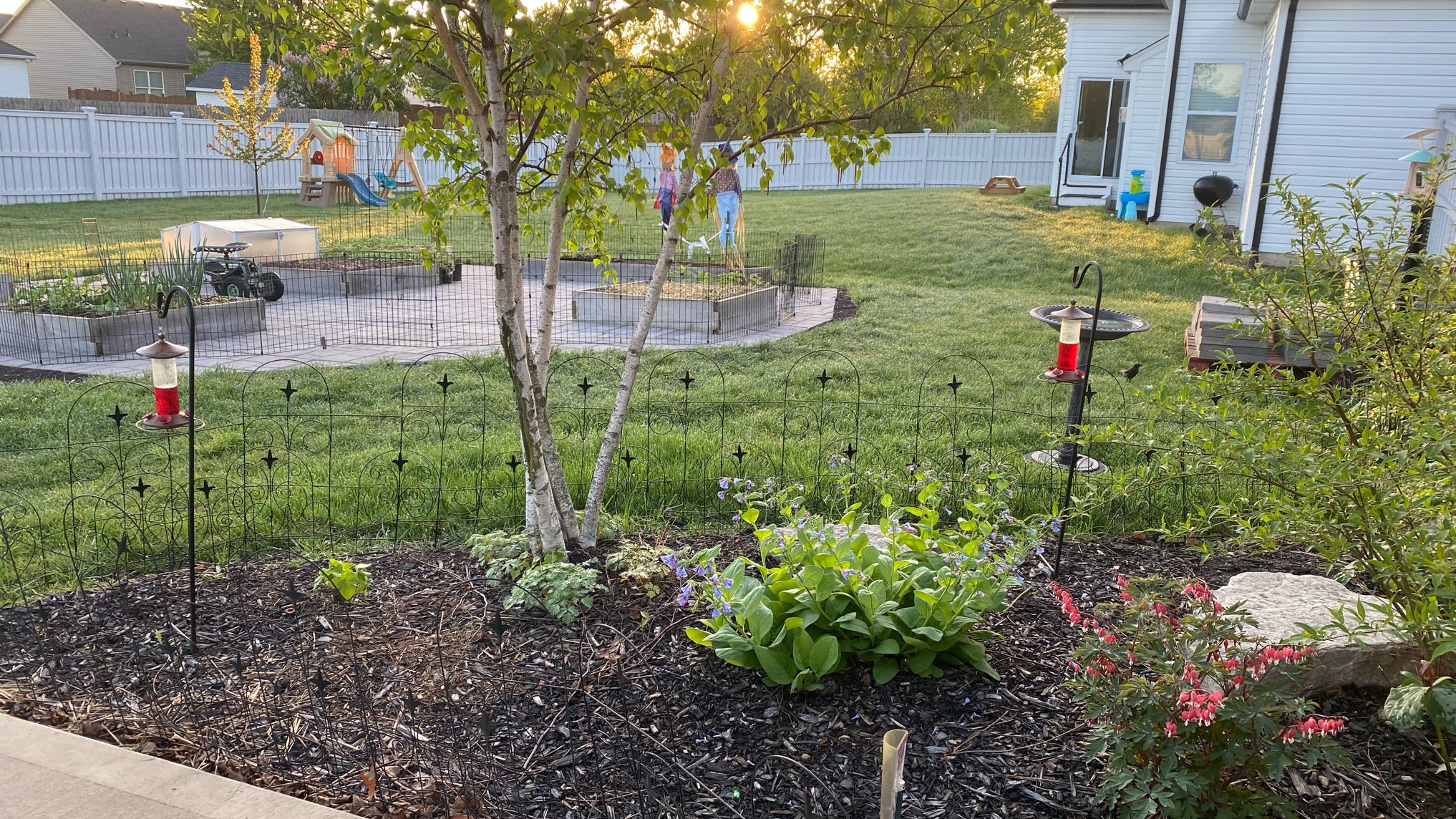 May 10 Repotted the container tomatoes. Still watching for the hummingbirds to return to my feeders.
