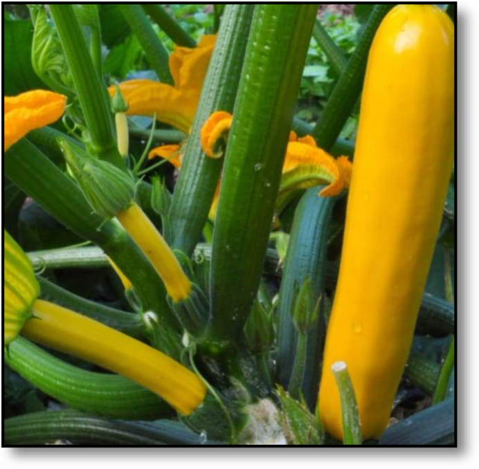 Golden Glory - 50 days - bright, flashy yellow zucchini with excellent production while under pressure from disease and bugs. The flesh is meaty, not watery, and is tasty marinated and grilled. Harvest fruits at 7-8”. Intermediate resistance to powdery mildew, watermelon mosaic virus, and zucchini yellow mosaic virus.