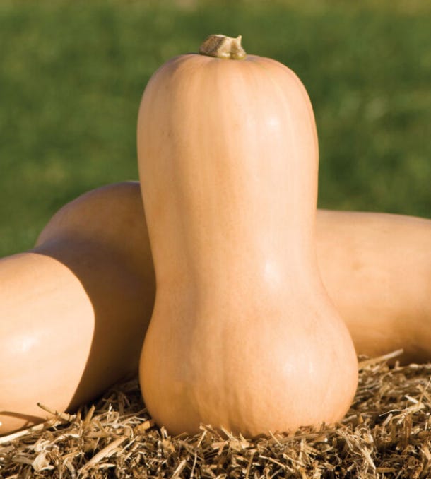 Waltham Butternut produces large fruits with small seed cavities and thick, straight, cylindrical necks. Waltham has smooth texture and sweet flavor, particularly after 2 months of storage. This 1970 All-America Selections winner from Massachusetts is the most widely grown full-size open-pollenated butternut. Fruits avg. 9" long. Avg. weight: 4–5 lb. It stores well.