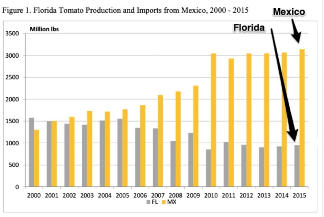 Mexico competes directly with the Florida tomato industry by exporting nearly $2 billion worth of fresh-market tomatoes into the USA annually. Florida producers complained bitterly to get out of a 1996 trade agreement with Mexico that they insisted allowed Mexico to dump tomatoes into the USA below production costs.