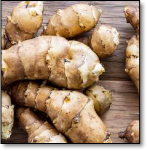 The Jerusalem Artichoke, a perennial member of the Daisy family Asteraceae, aka Compositae, is native to North America. It produces knobby, white-fleshed tubers that can be eaten raw or cooked. Plants grow 6 feet tall and are covered with 2 inch yellow sunflowers in late August and September. When the plants begin to die back in the fall the chokes are ready to harvest. Take only what you need. Mulched tubers can be harvested all winter. Any remaining tubers in the spring will sprout and produce new plants. I mostly use the tubers sliced very thinly as you would water chestnut as a topping for salads. I’m not sure most palates could tell the difference.