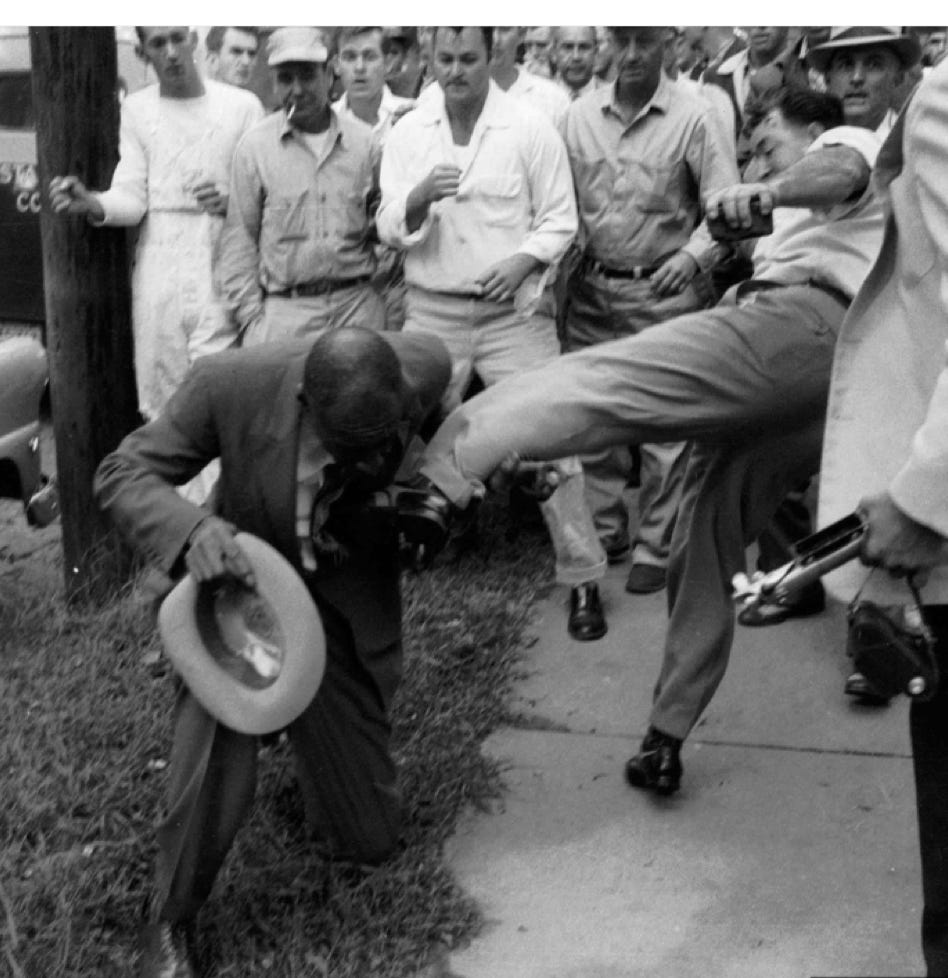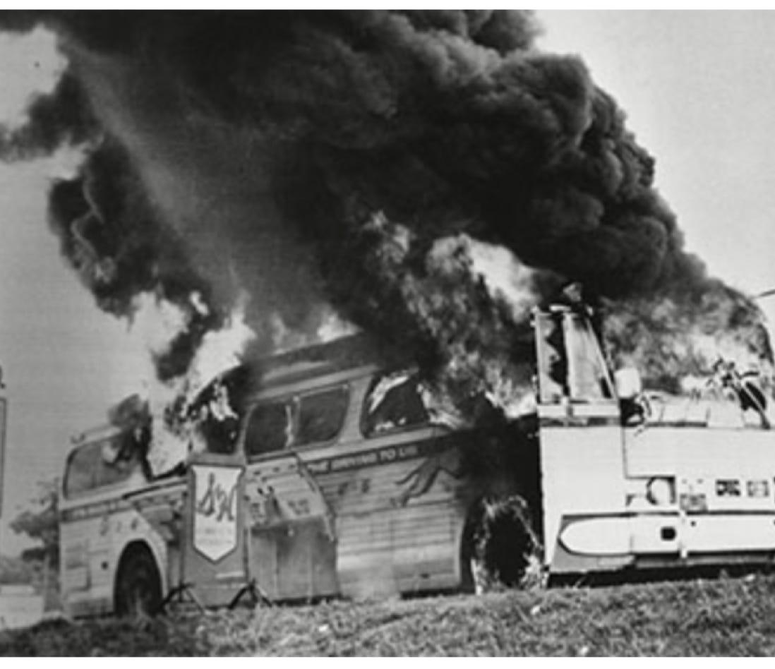 100 years later segregationist were again opposing interstate travel. Jim Crow laws made it illegal for Blacks to use most public transportation. CORE organized freedom riders boarded buses in DC bound for New Orleans to challenge these racist regulations. Their ride ended, as Martin Luther King predicted, in Alabama 100’s of miles short of its Louisiana goal. After suffering beatings and arrests in Virginia and South Carolina, the Freedom Riders were met by over 100 Klansmen in Anniston, Alabama. As the first bus pulled up, the driver yelled outside, “Well, boys, here they are. I brought you some niggers and nigger-lovers”